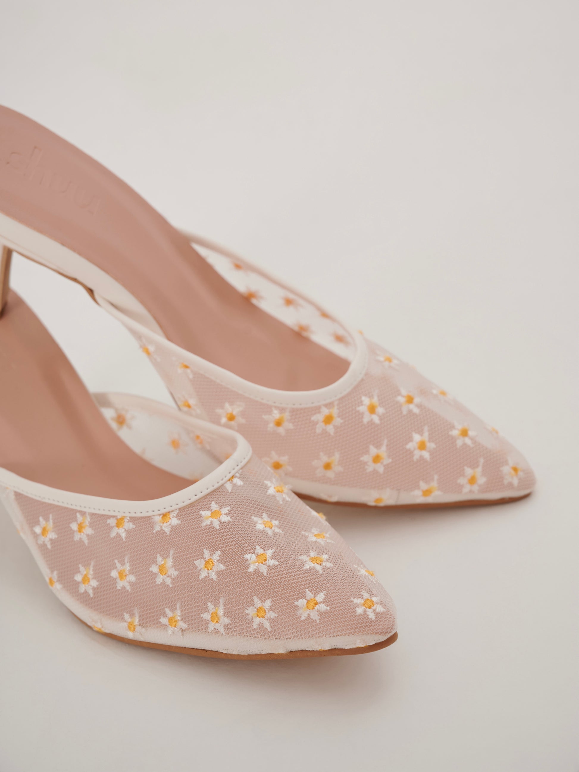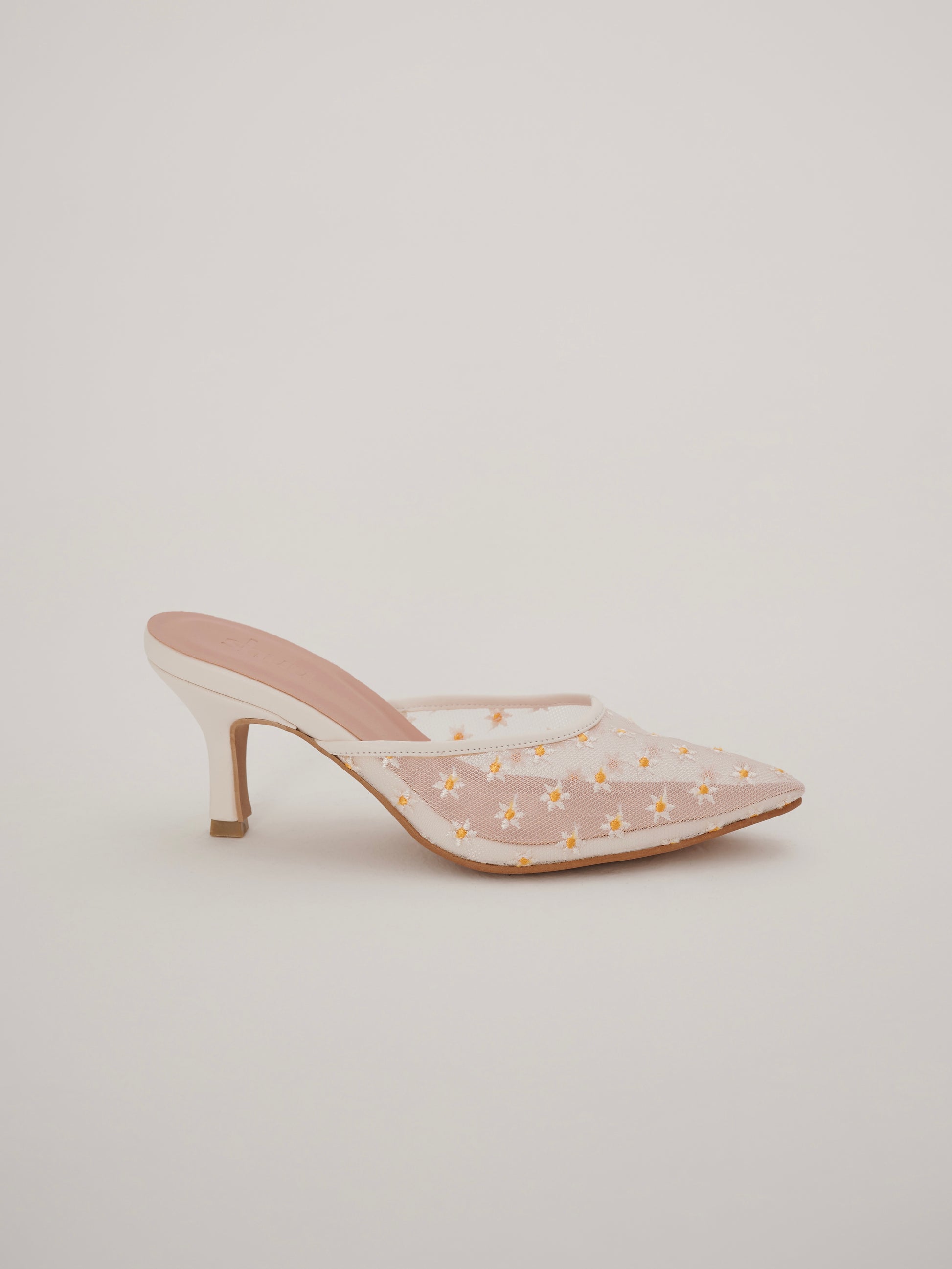 The Cosette Heels are designed to bring a soft, romantic touch to your everyday style. Featuring a pointy toe and a sheer mesh upper delicately embroidered with floral details. The slip-on silhouette and comfortable heel make Cosette perfect for adding a polished finish to both casual outfits and more dressed-up moments.